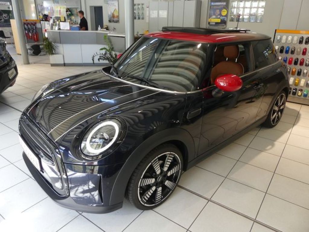 3 trg., Lackierung Enigmatic Black Metallic, 18 Zoll LM Felgen Sommerreifen, Spiegelkappen rot, Dach 3 Farbig rot, silber, schwarz, Panoramadach mit Ausstellfunktion, Türgriffe in Wagenfarbe, Dekorstreifen auf der Motorhaube, Piano Black Exterieur, LED Scheinwerfer, getönte Scheiben, MINI Yours Emblem, Spiegel elektr. anklappbar